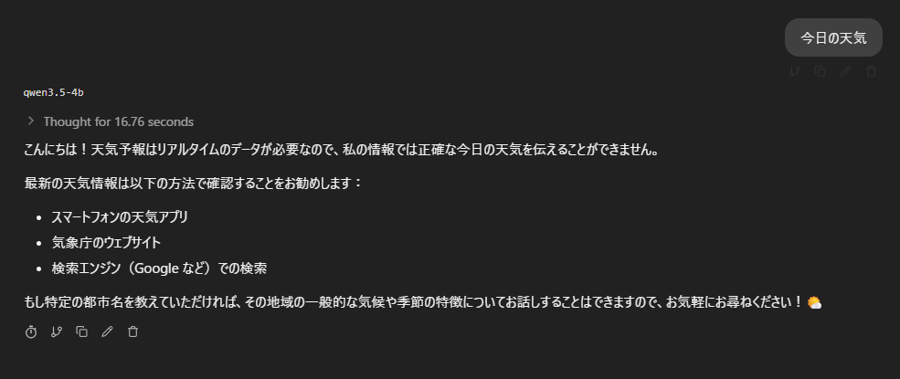今日の天気と入力すると16秒くらいかかって下のように返ってきました。オフラインだからこういう回答になったんだろうなという感じです。
