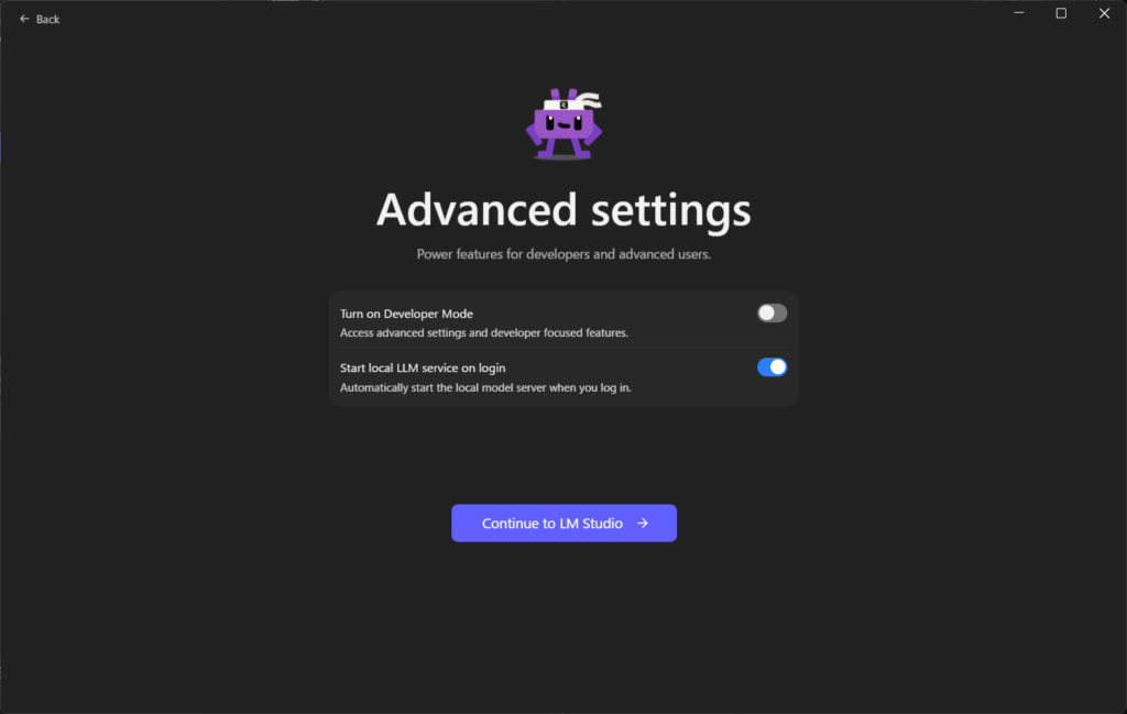 開発者モードと起動時にローカルAIサーバーを自動起動するかどうかですがこのままでOK