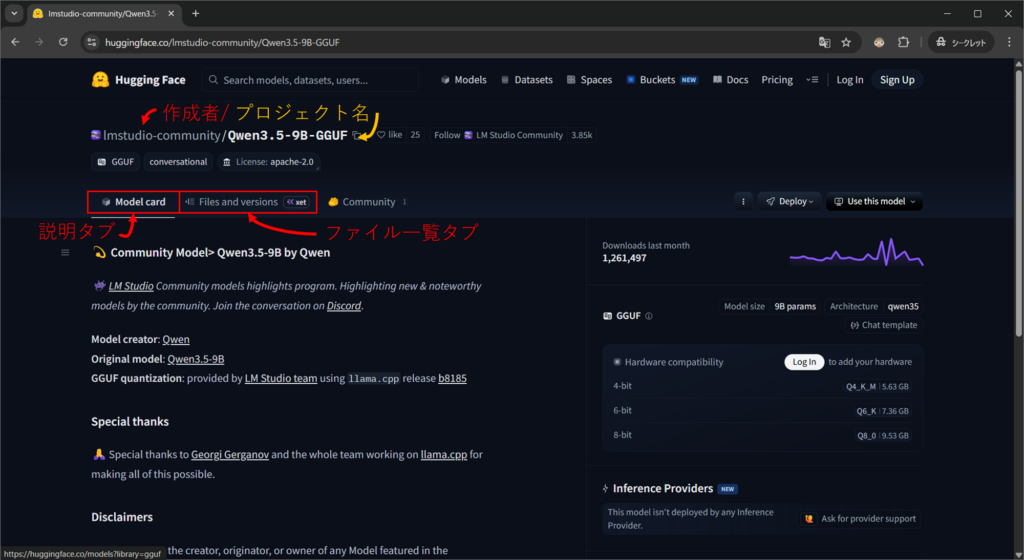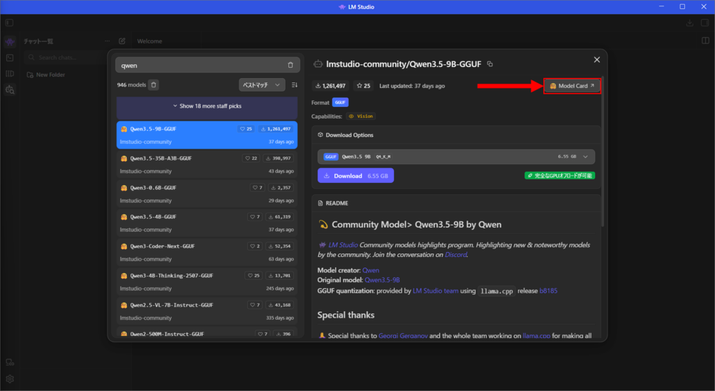 説明欄に「Based on Qwen」や「Based on Llama」といった記載があるはずです。